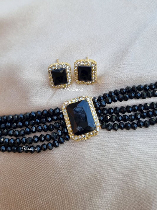 Black Centre Stone American Diamond Necklace With Earrings