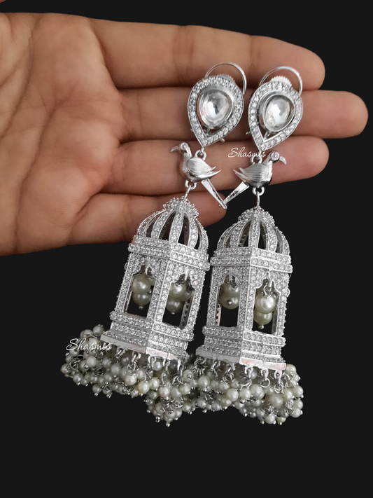 Diamond Cage Earrings With Parrot On Top and Pearls On Drop