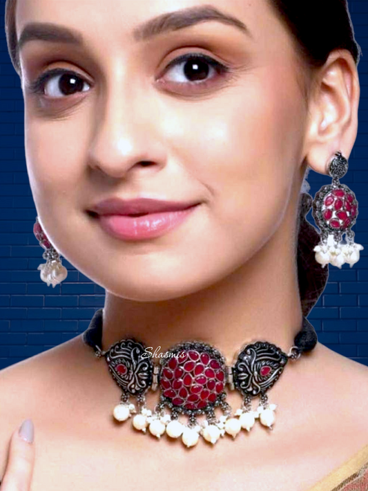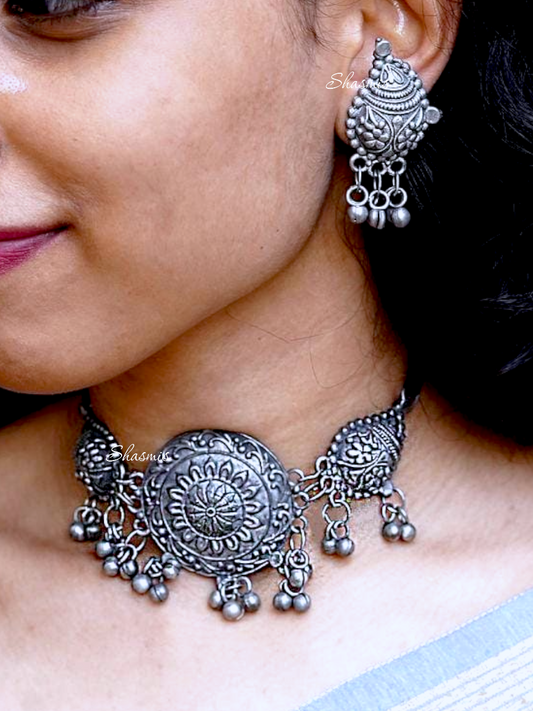 German Silver Oxidised Choker With Earrings