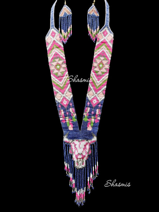 Beaded Long Necklace With Bull's Head Design, Contemporary Necklace With Earrings