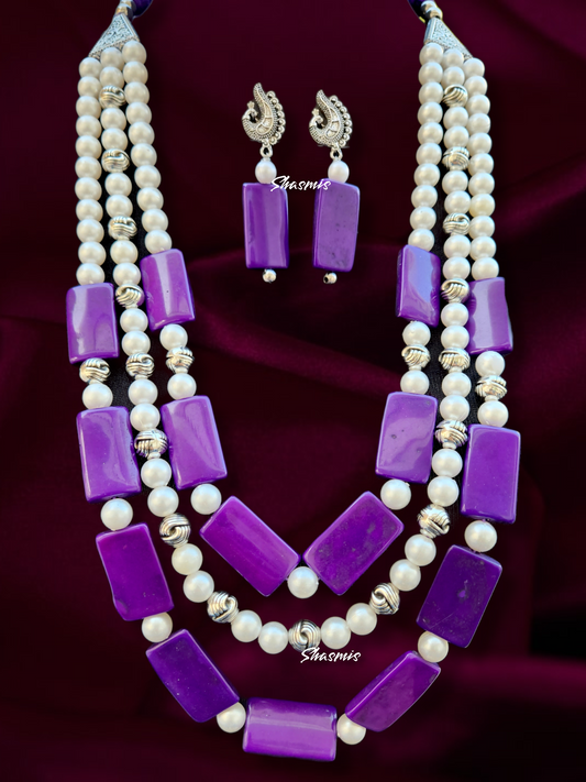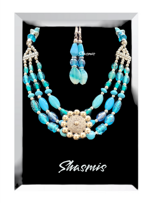 Blue Color Layer Beads With Silver Pendant Boho Fashion Necklace With Earrings