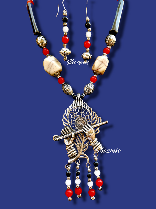 White and Black Beads Long Peacock Feather Silver Boho Necklace With Earrings