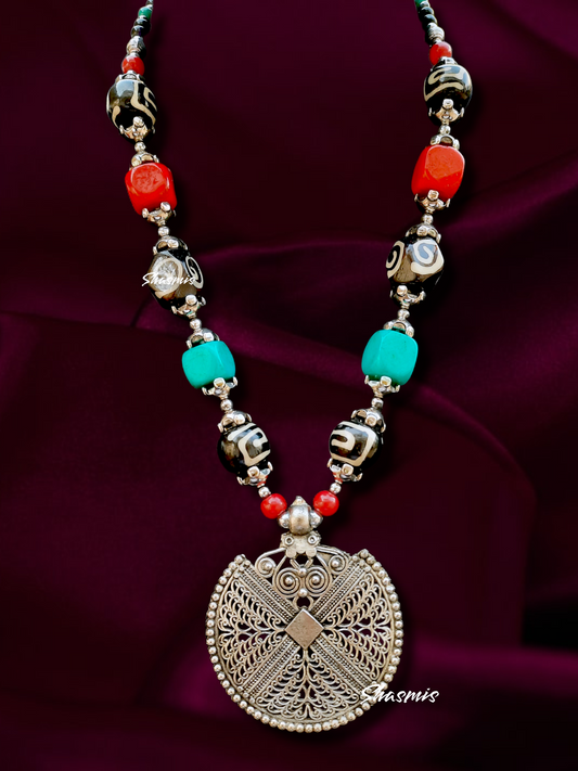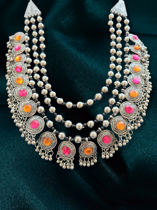 Long Silver Boho Fashion Necklace With Red and Blue Beads and Earrings