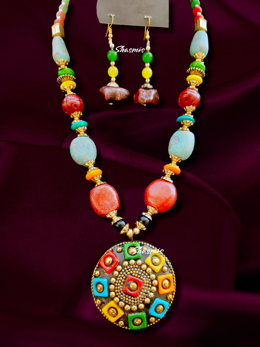 Long Multi Color Beads With Design Pendant Boho Necklace With Earrings