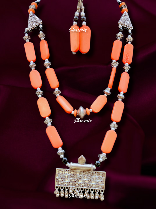 Long Orange Color Beads With Silver Rectangle Pendant With Ghungroo On Drop and Earrings