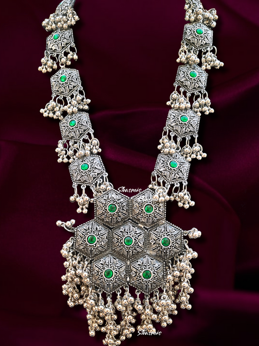 Long Silver Oxidised Green Stone Necklace With Ghungroo Design