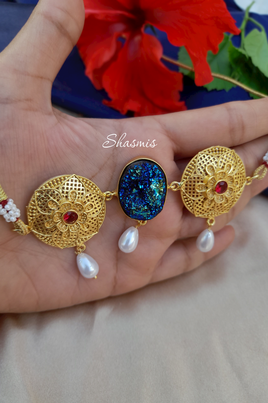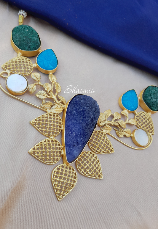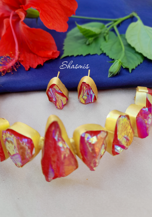 Blue Druzy Stone Necklace With Red Stone On Pendant and Earrings