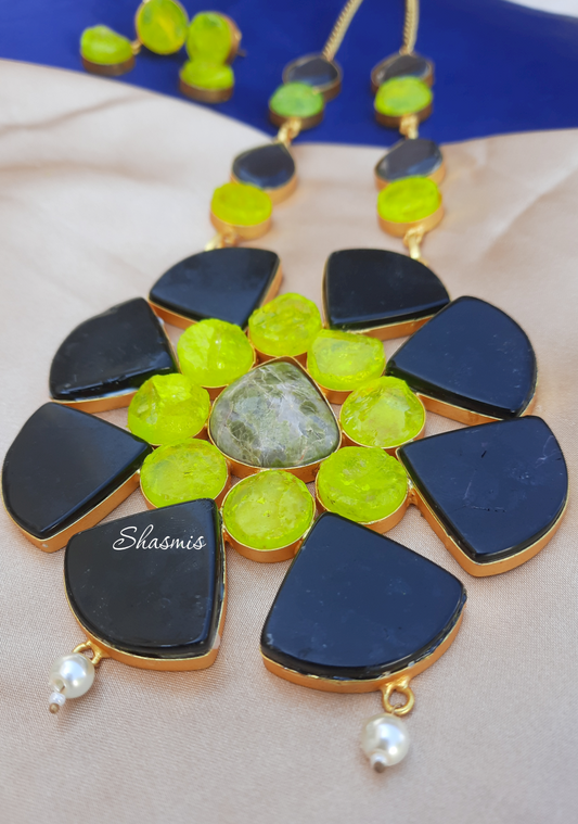 Black and Neon Yellow Color Long Chain Druzy Necklace with Earrings