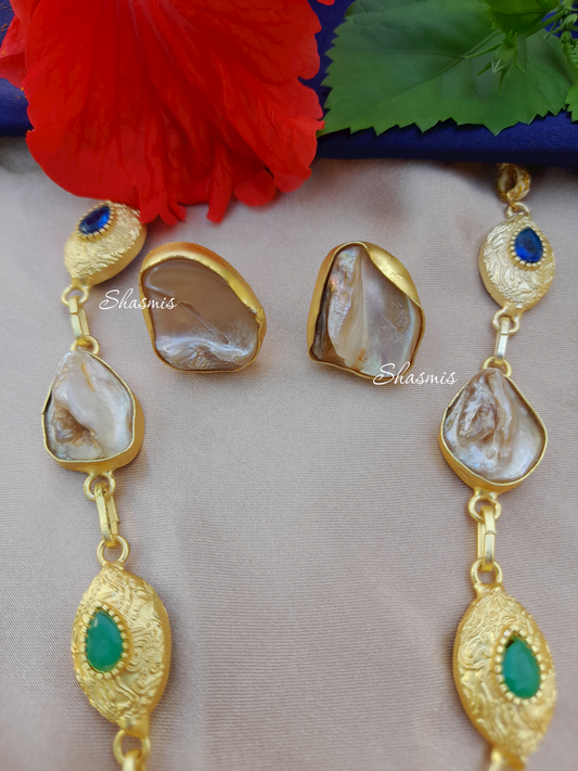 Black Centre Stone With Beige Color Druzy Necklace, Natural Mother of Pearl And Earrings