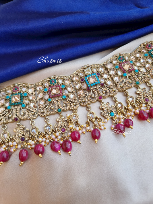 Statement Necklace With Multi color Stone And Red Beads On Drop