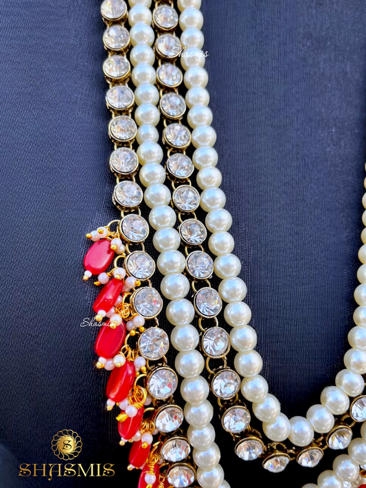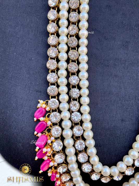 Pink Beads Glass Kundan Long Layer Necklace With Earrings