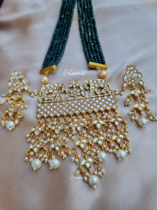 Black Color Pearls Beads Necklace With Huge Kundan Pendant And Earrings
