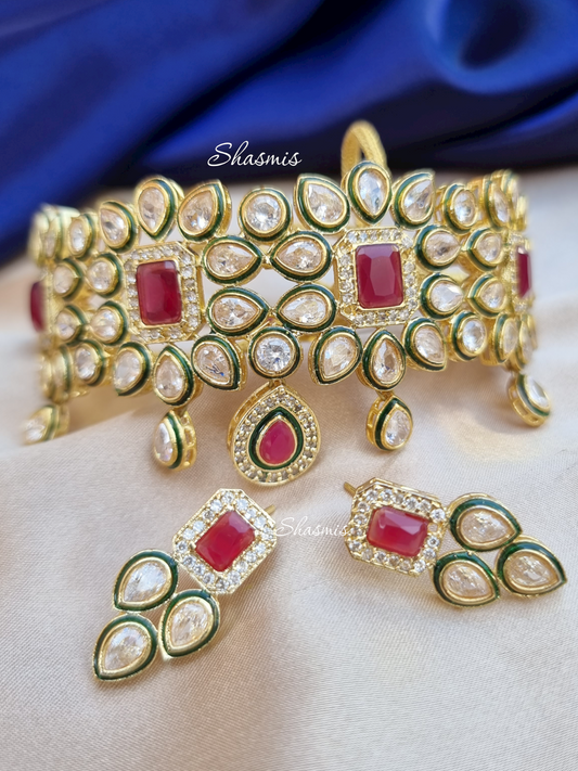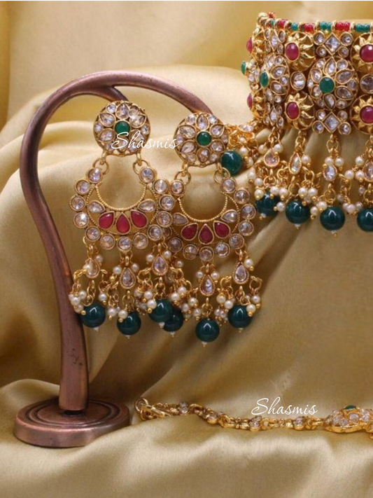 Ruby and Green Stone Gold Plated Kundan Neck Choker With Earrings and Mangtika