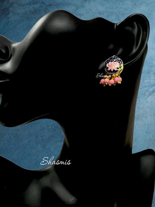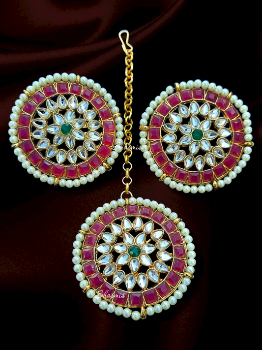 Pink Color Stone With Green Pearl On Drop Necklace With Earrings and Mangtika