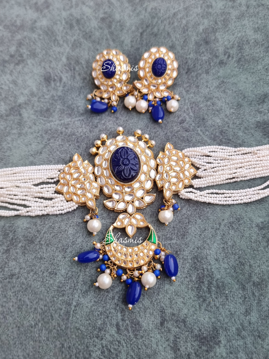 Blue Carved Stone With Chand Bali Pendant Necklace With Earrings