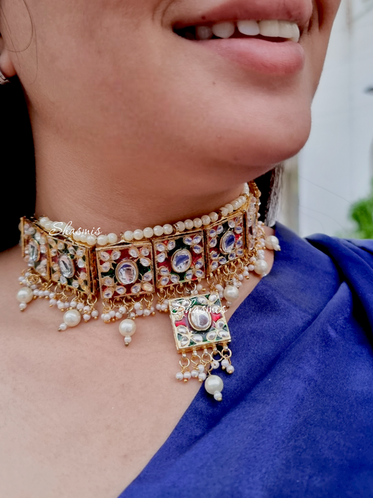 Red Color Kundan Statement Necklace And Earrings With Pearls On Drop