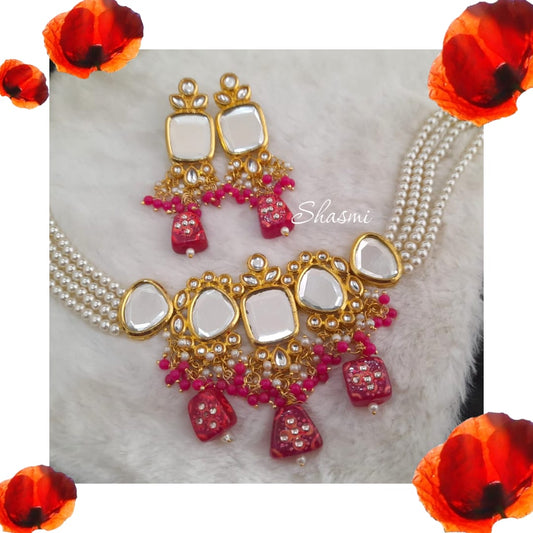 Pink Color Beaded Layer Necklace Choker With Earrings