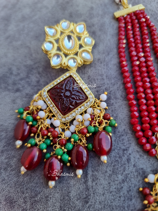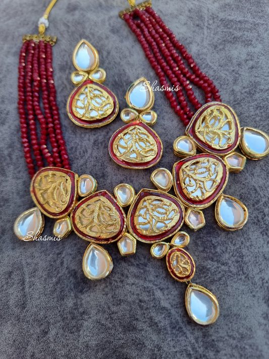 Maroon Color Kundan Necklace With Carved Stone and Earrings