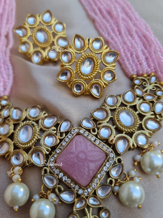 Pink Color Carved Stone Necklace And Earrings With White Beads