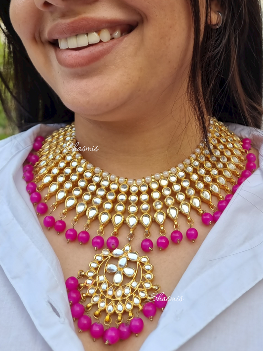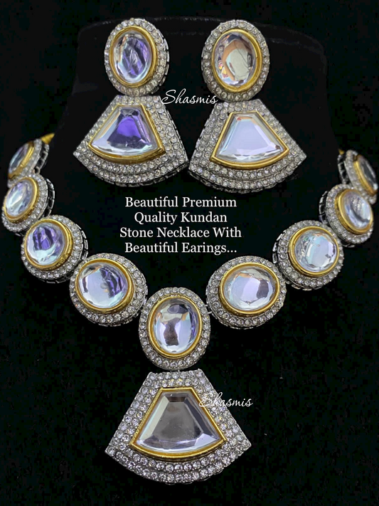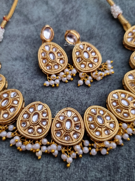 Golden Plating Kundan Stone and Pearl on Drop Necklace With Earrings