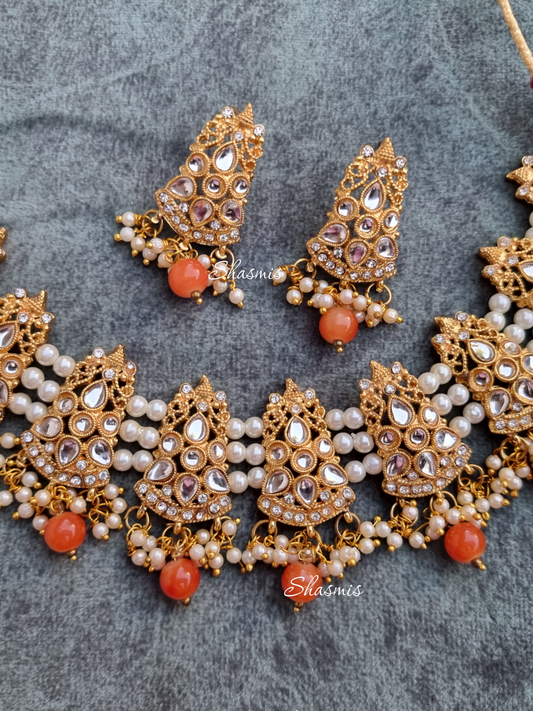 Golden Plating With Orange Pearl on Drop Neck Choker With Earrings