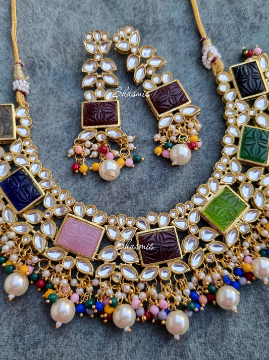 Square Shade Carved Stones With Kundan Beads And Pearls On Drop Necklace With Earrings