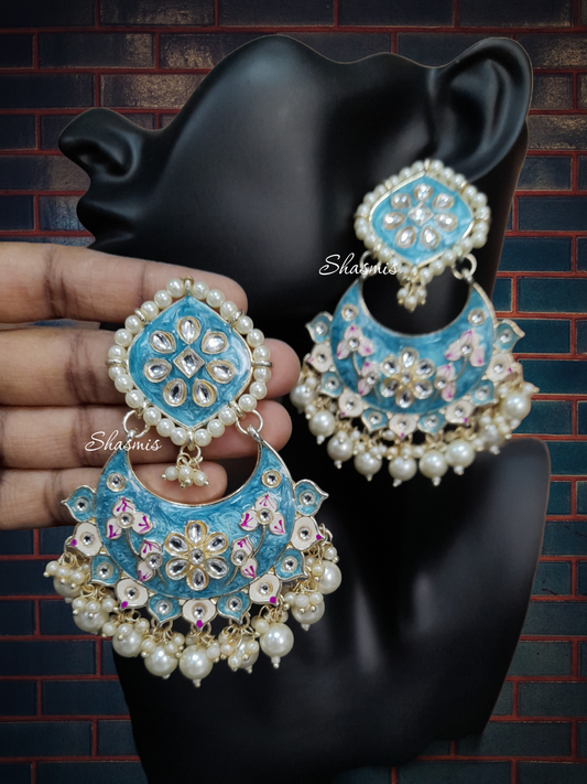 Sky Blue Color Long Kundan Pearl Necklace, With Earring And Mangtika