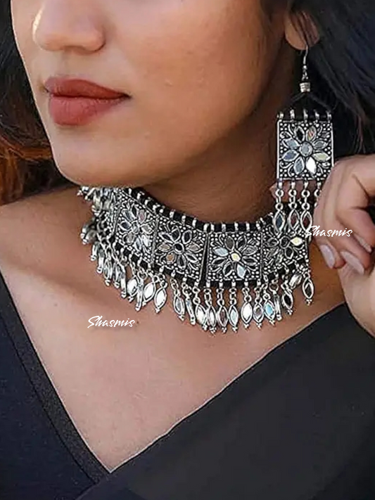 Flower Design Silver Mirror Statement Necklace With Earrings