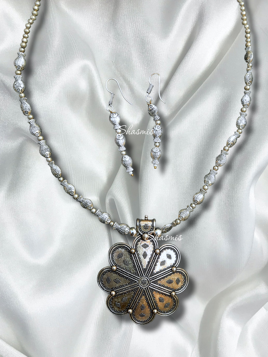 Long Drop Silver necklace With Pearls and Ghungroo On Drop with Earrings
