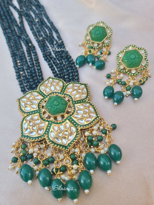 Centre Stone Kundan Long Necklace With Pearls On Drop and Earrings