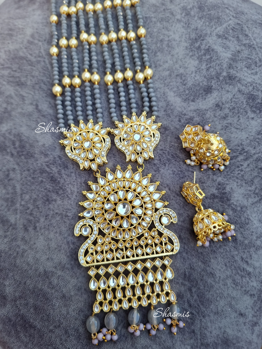 Grey Color Long Necklace And Earrings With Kundan Stones and Pearls