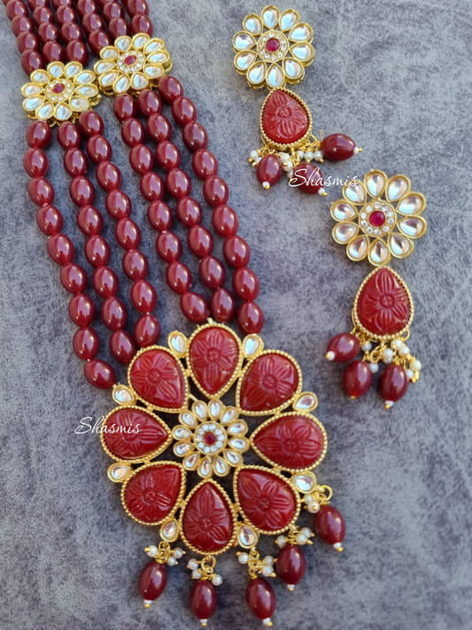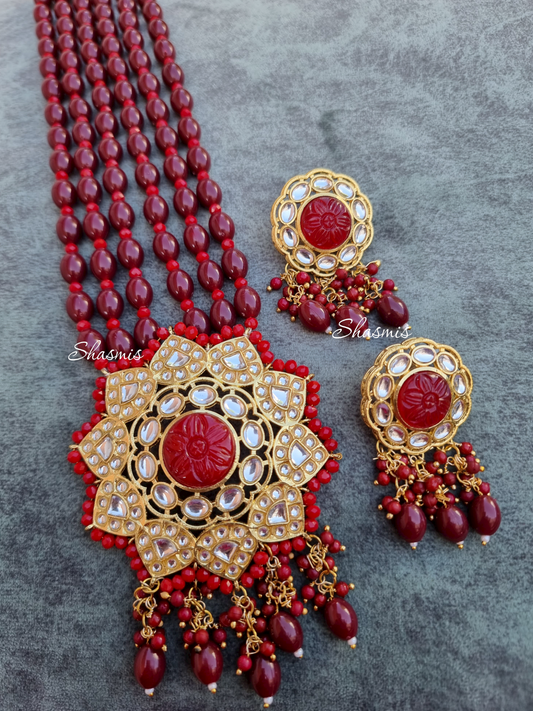 Red Color Long Beaded Polki Kundan Necklace With Earrings