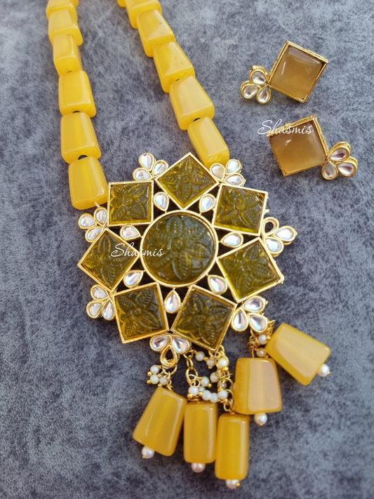 Carved Stone Kundan Long Necklace With Earrings