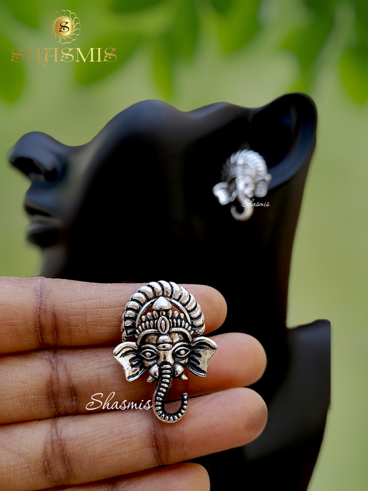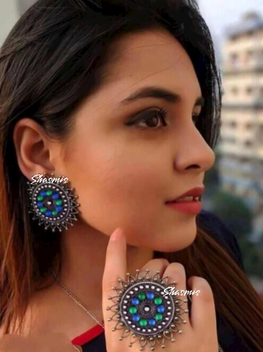 Maroon Stone Oval Design Silver Oxidised Earrings
