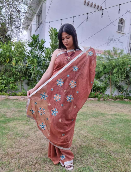 Beige And Orange Color with Black Velvet Border And Silver Lace Silk Saree
