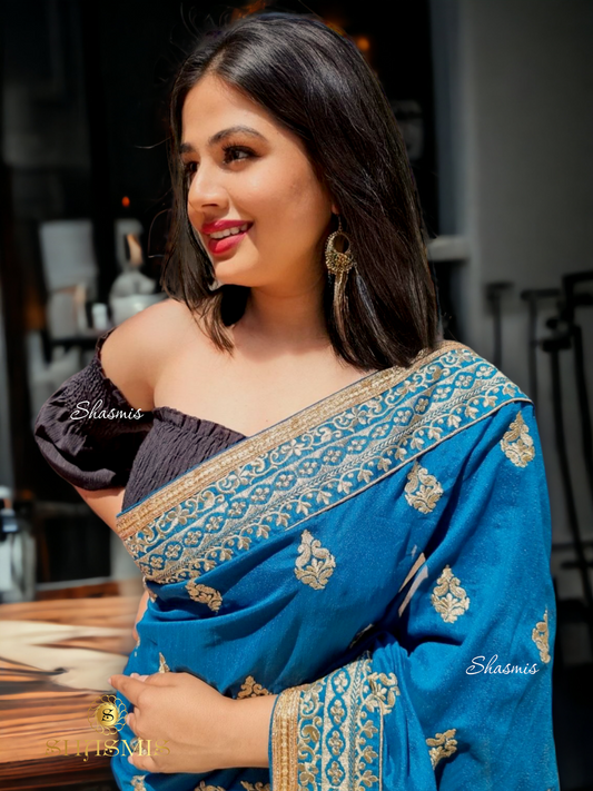 Rama Blue Color Silk Saree With Heavy Embroidery Border