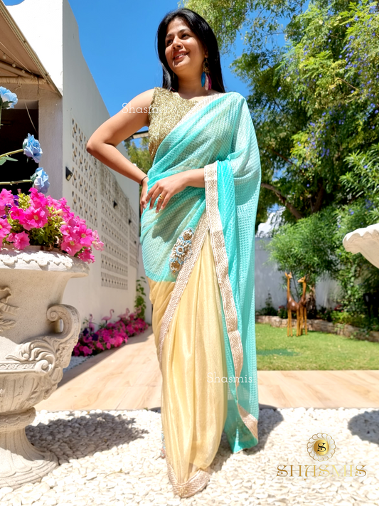 Golden Shade With Mint Blue Net Design Georgette Saree