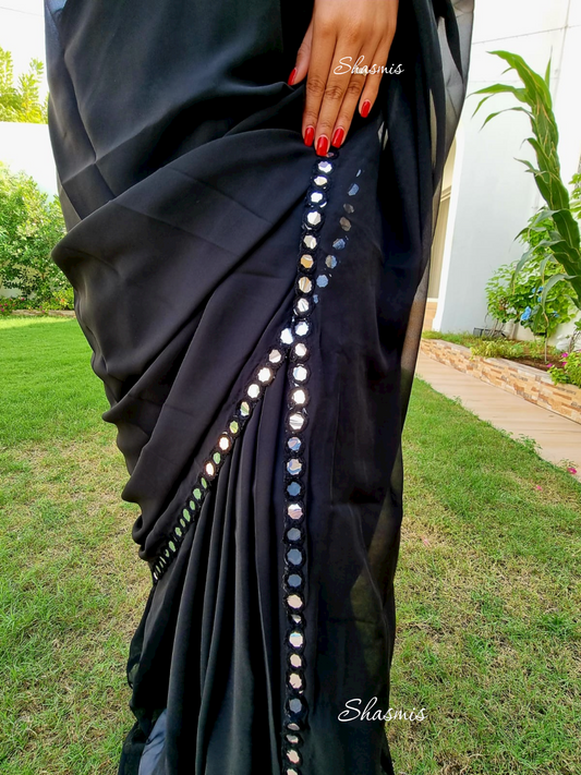 Black Color Georgette Saree With Foil Mirror On Lace