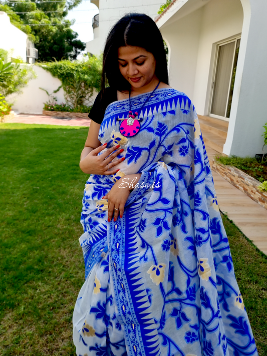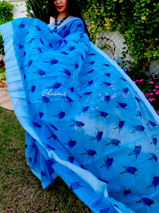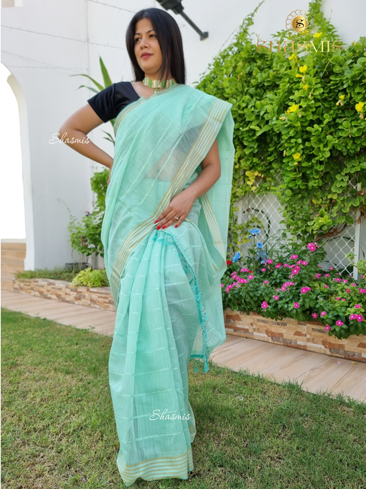 Blue and White Pure cotton Linen Saree With Gold Zari Work