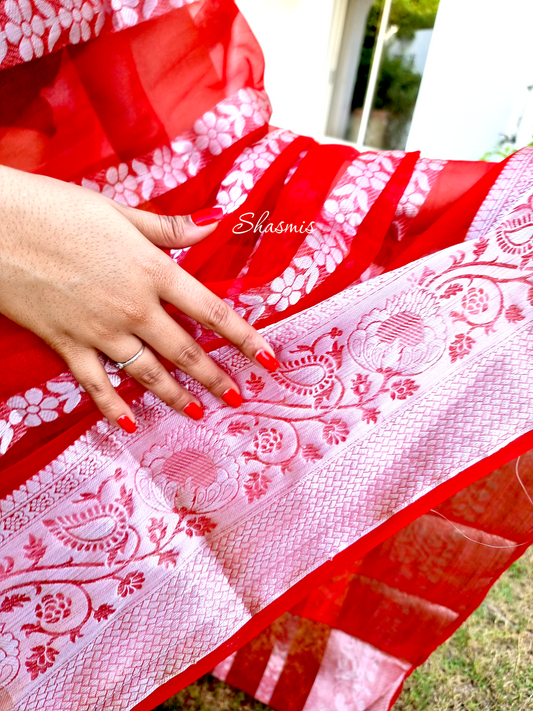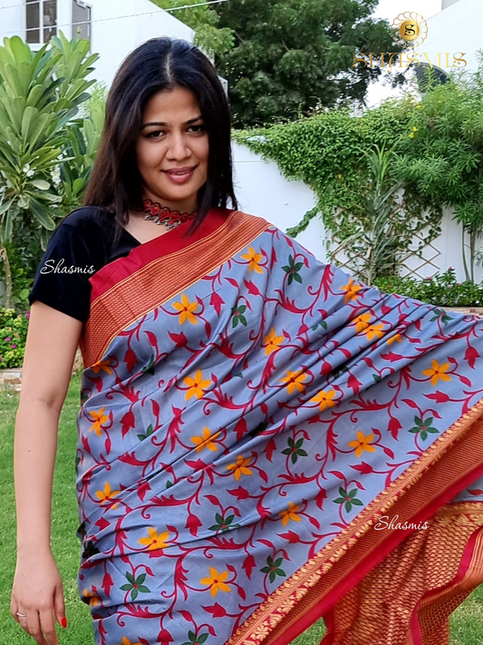 Grey Saree With Red Border, Printed Assam Soft Silk