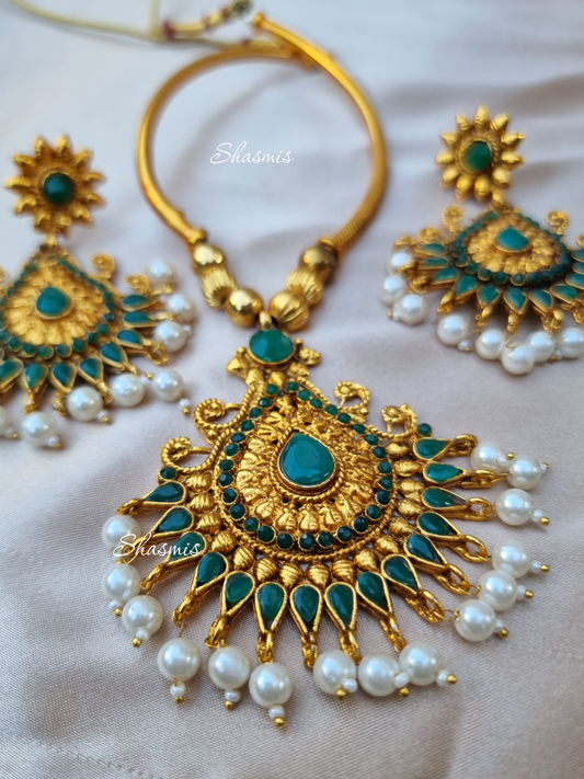 Golden Plated Temple Necklace With Pearl On Drop With Earrings