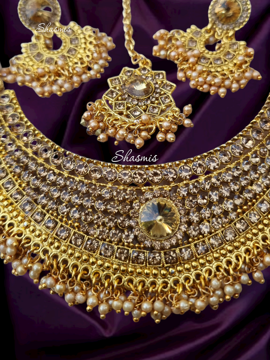 Gold Plated Temple Jewellery Necklace And Earrings With Rhinestone and Ruby Centre Stone