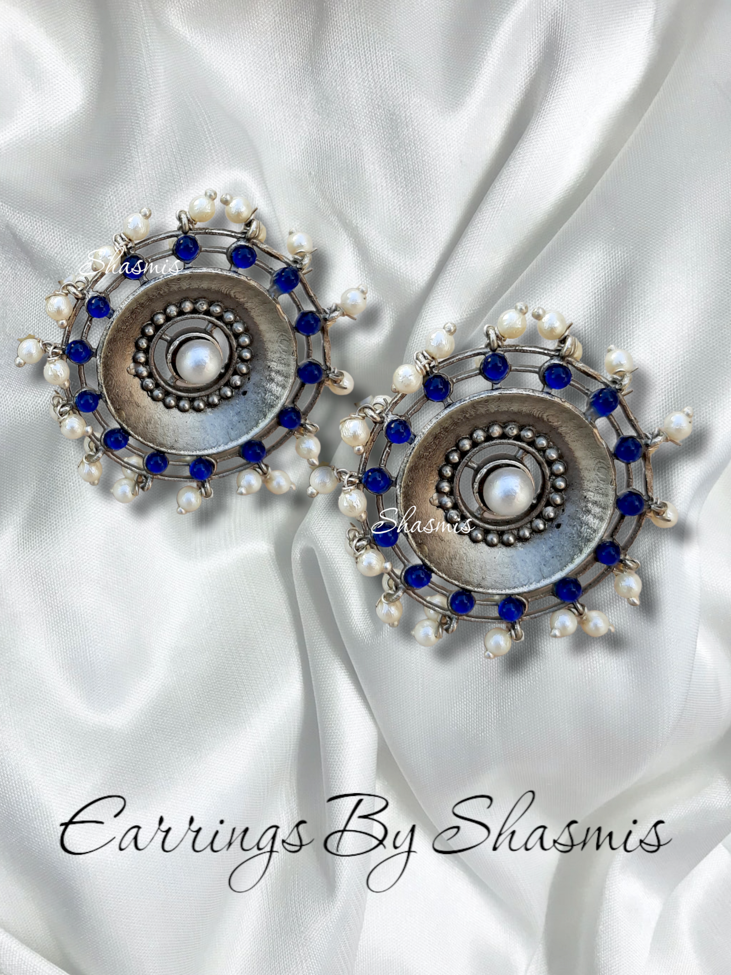 Blue Stone With Centre Pearl Silver Oxidised Earrings