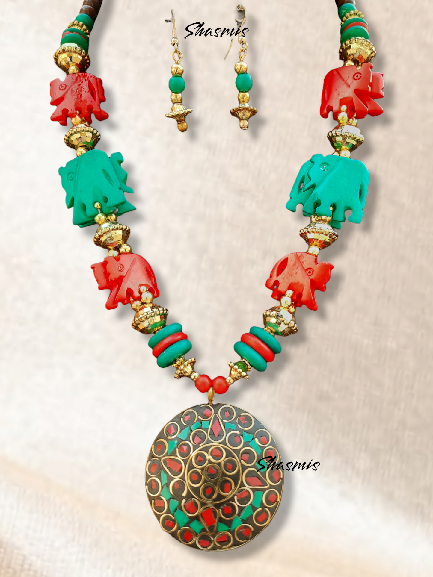 Long Tibetan Boho Necklace With Elephant Beads and Earrings